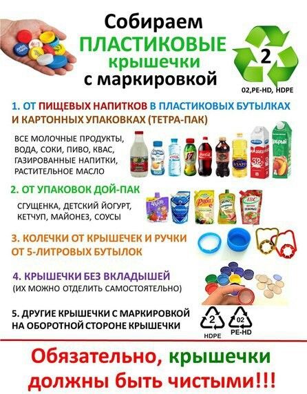 Собираем крышки от пластиковых бутылок, бумажных упаковок (тетра-пак), колечки и ручки от 5-литровых бутылок. Деньги от переработки крышек будут направлены на покупку реабилитационного оборудования и оплату лечения детей-инвалидов