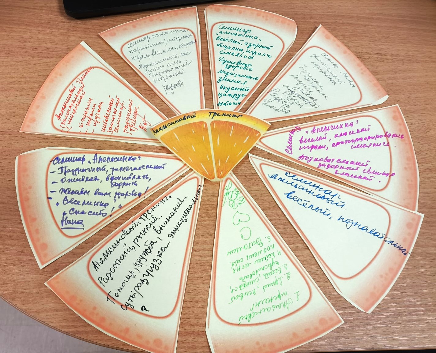 Почему «апельсиновый»? Потому что апельсиновый – это значит нестандартный, праздничный, нескучный, оранжевый, энергичный! И по структуре апельсин напоминает тренинговую группу: в целом фрукт – это совокупность долек, каждая по-своему хороша и вкусна, но только все вместе – это апельсин!