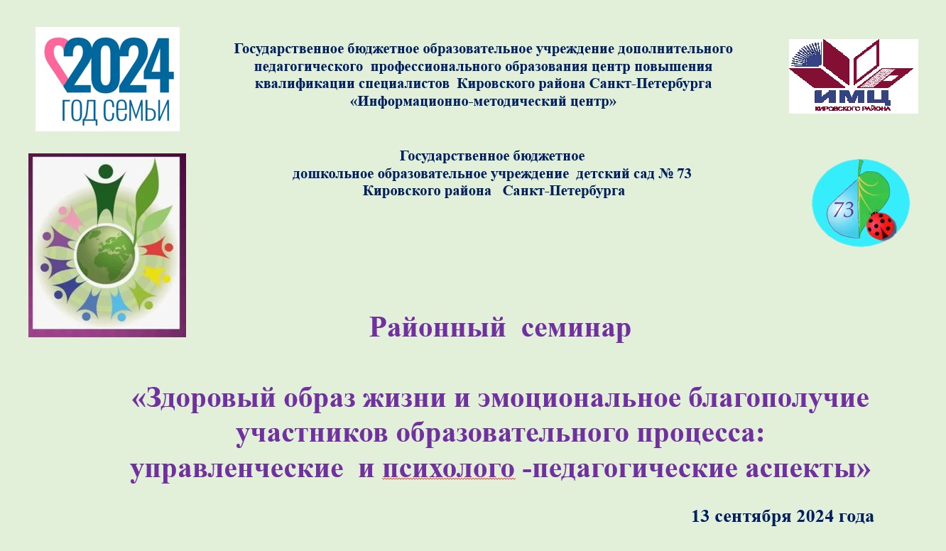 13 сентября 2024 года на базе ГБДОУ детский сад № 73 прошел районный семинар «Здоровый образ жизни и эмоциональное благополучие участников образовательного процесса»