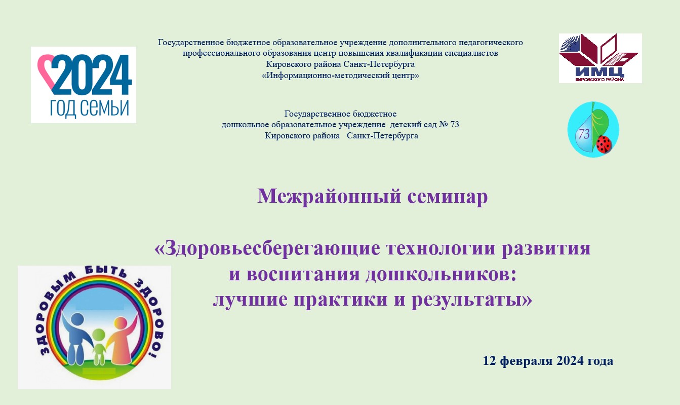 12.02.2024 на базе ГБДОУ детский сад 73 Кировского района состоялся межрайонный семинар – практикум «Здоровьесберегающие технологии развития и воспитания дошкольников: лучшие практики и результаты»